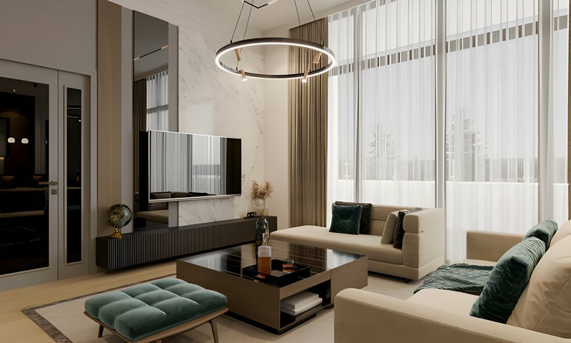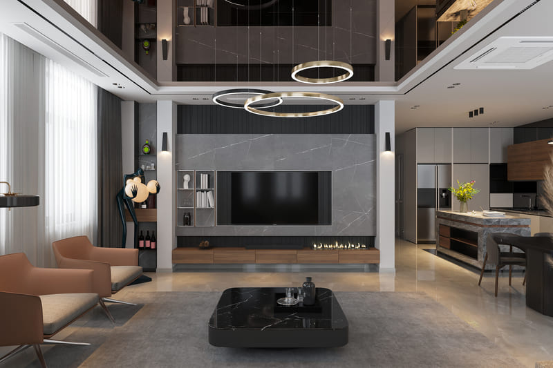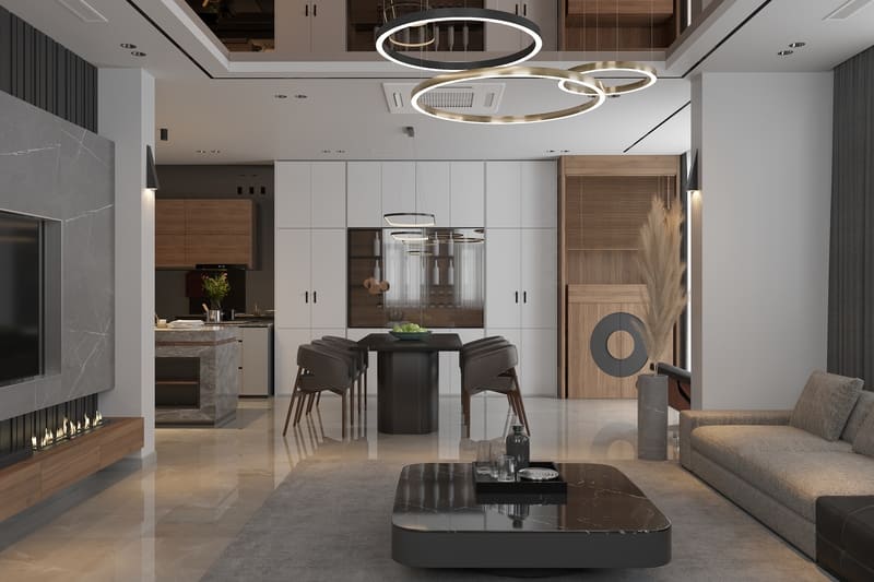 Phong cách hiện đại chú trọng vào sự tối giản trong thiết kế của các thiết bị nội thất. Những món đồ sử dụng thường có hình dáng rõ ràng, góc cạnh và mạnh mẽ như hình vuông, hình chữ nhật. Màu sắc thường được sử dụng là các màu trắng, be, nâu, đen, xám… Bên cạnh đó, vật liệu cấu tạo của đồ dùng phần lớn là kim loại, đá, gỗ, kính. Những mẫu phòng khách liền bếp trong kiểu nhà hiện đại mà bạn có thể tham khảo gồm: