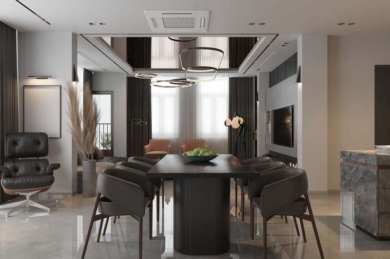 Mẫu phòng khách tân cổ điển có điểm nhấn là tủ và ghế ngồi lớn màu tối